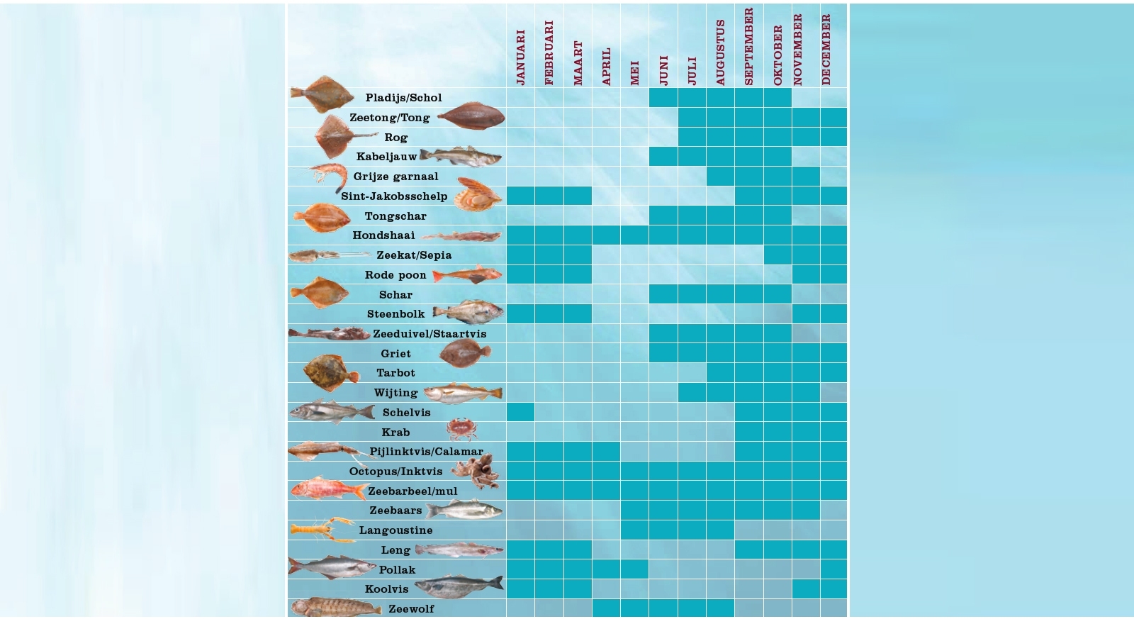 Deze kalender geeft aan wanneer een bepaalde vissoort van goede kwaliteit is en zonder problemen gegeten kan worden.